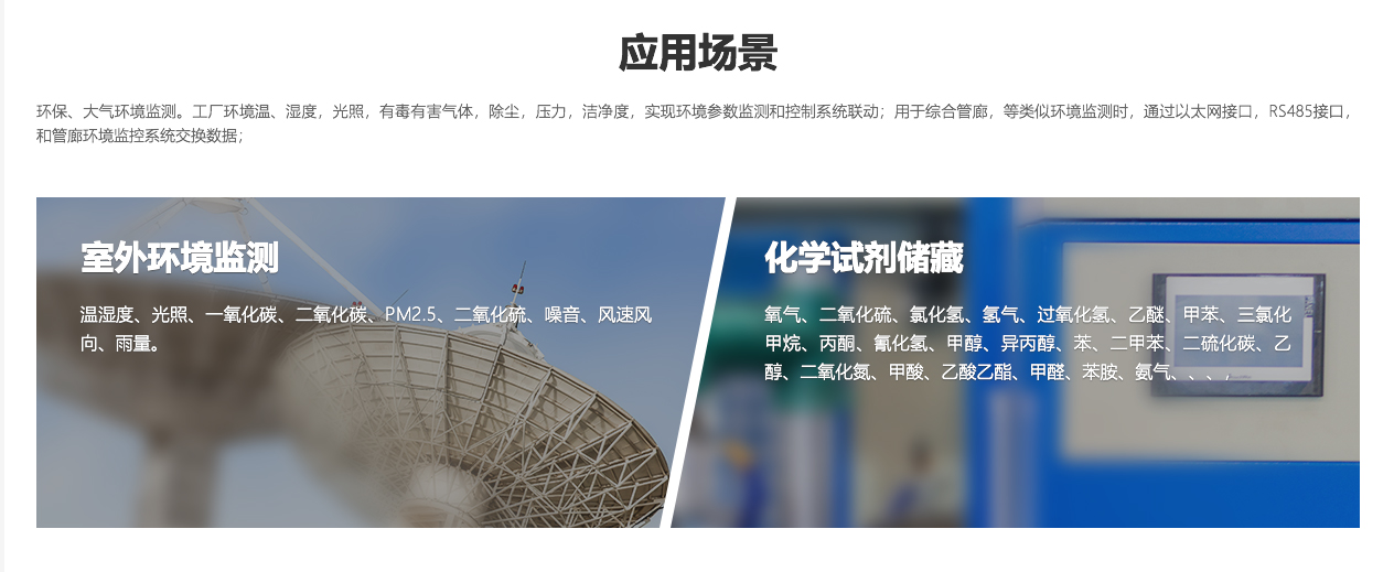 环保、大气环境监测。 工厂环境温、湿度,光照,有毒有害气体,除尘,压力,洁净度,实现环境参数监测和控制系统联动; 用于综合管廊,等类似环境监测时,通过以太网接口,RS485接口,和管廊环境监控系统交换数据;