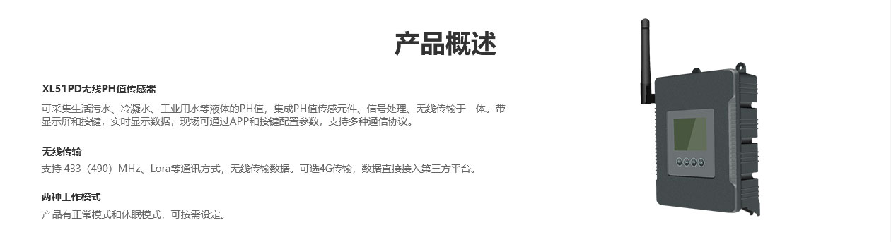 XL51PD无线PH值传感器,采集生活污水、冷凝水、工业用水等液体PH值,集成PH值传感元件、信号处理、无线传输于一体。带显示屏和按键,实时显示数据,现场可通过APP和按键配置参数,支持多种通信协议