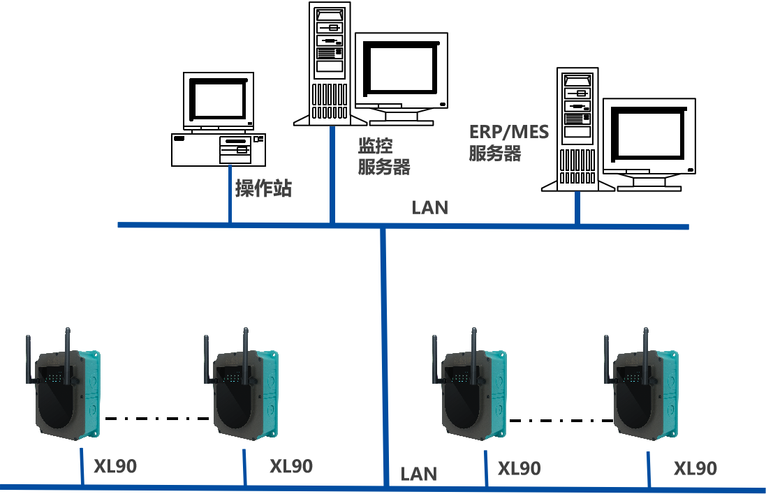 XL90物联网关,是系统的核心,从XL60上读取数据,进行协议转换、通讯处理,通过企业内部LAN,推送数据至企业生产监控平台