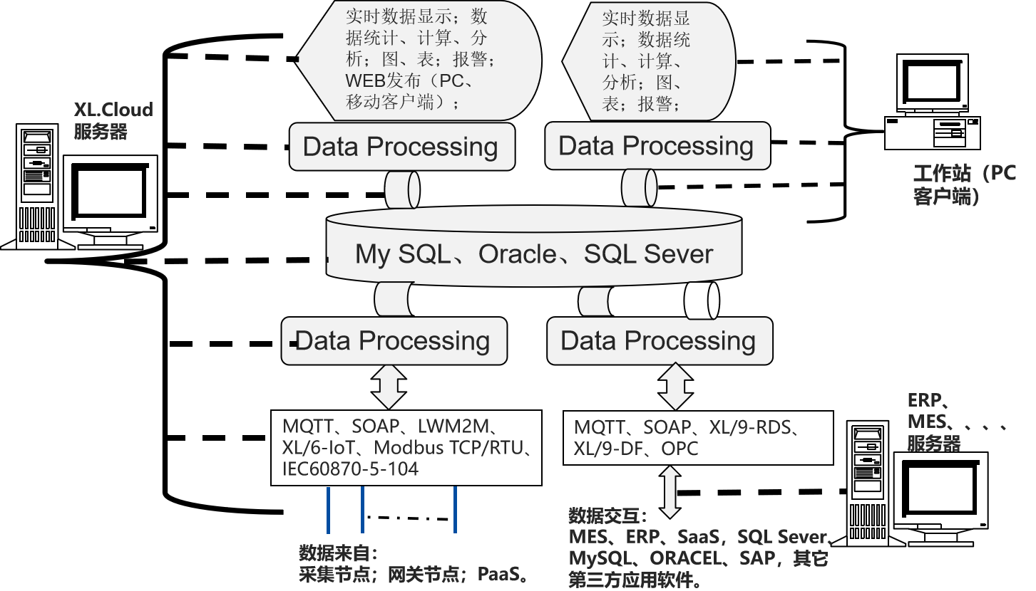 支持MQTT、LWM2M、SOAP,XL/6-IoT、XL/9-DB、XL/9-RDS,等等通信协议,并可和第三方数据库,Oracle、SAP等交换数据