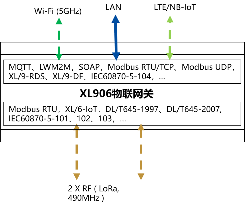 物联网关,通过以太网,或NB/GPRS/LTE联接云端,支持MQTT,LWM2M,XL/6-IoT协议,或用户指定协议