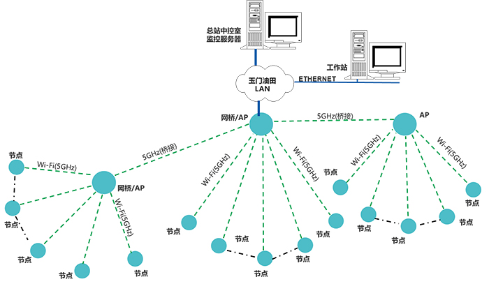 借助老君庙区域,玉门油田的内部局域网(LAN),设计传输网络,传输采集节点的数据。并预留有LoRa和4G的通信方式,以应对其它地理环境下对传输方式的要求。
