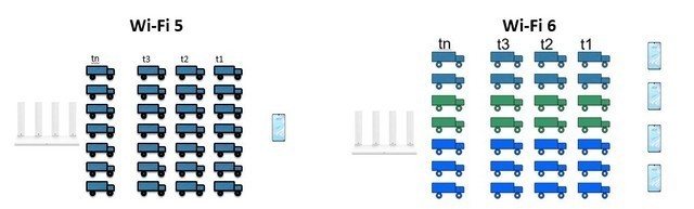 我们可以将路由器向设备传输的场景比喻成一个车队,在WiF i5标准下,同一时刻出发车队只能派送到一个客户,即使有空车也照常发车,如果有车出现故障(受干扰),整个车队都无法发车。而在WiFi 6标准下,同一时刻出发的一个车队,可以将相邻的最少26辆车组成一个小队,每个小队可以派送到不同的客户,如果有车出现故障(受干扰)只影响所在的小队。