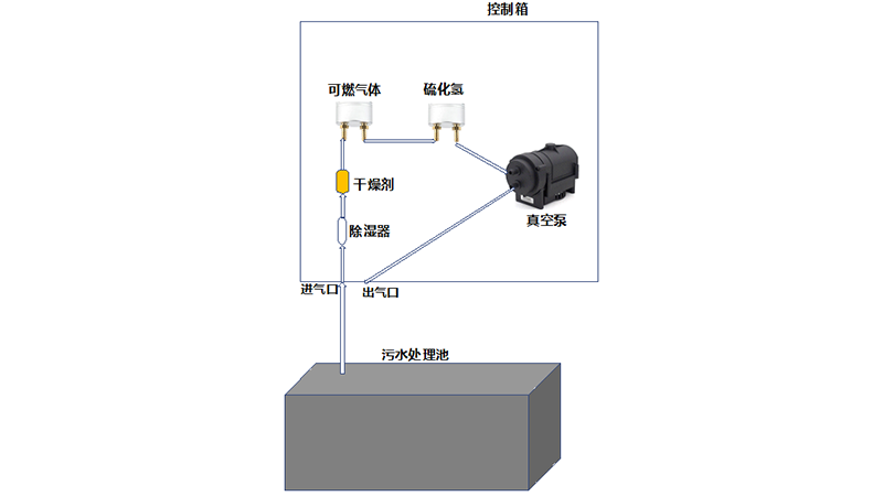 过程:用聚四氟乙烯管,联接整个气体通路。管直接伸入污水池,联接控制箱进气口,气体从进气口,至过滤器、除湿器,至传感器探头进、出气口(两台传感器的进、出气口串联),至真空泵抽气口,从真空泵排气口联接控制箱出气口;