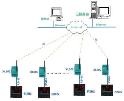 在每一个管网监测点,安装1台XL802无线通信主机,通信主机通过RS485口读取积算仪的数据,经过协议转换,通过全网通4G,上传数据至云服务器。