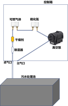 l 过程:用聚四氟乙烯管,联接整个气体通路。管直接伸入污水池,联接控制箱进气口,气体从进气口,至过滤器、除湿器,至传感器探头进、出气口(两台传感器的进、出气口串联),至真空泵抽气口,从真空泵排气口联接控制箱出气口;