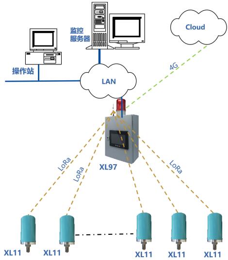 XL11系列传感器采集设备运行过程电动机、减速机等零部件的温度、振动数据,并通过 LoRa 或 LoRaWAN 无线通信方式,接入XL97物联网关终端,网关通过Ethernet、Wi-Fi、4G接口连接SCADS、DCS或云端监控平台,支持MQTT、API、SOAP(WEB Service )、Modbus RTU/TCP协议。