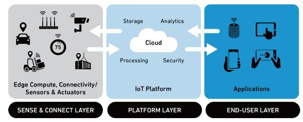 物联网大致分为3 层。第1 层为感知和连接层,用于将物联网硬件连接到执行数据处理和存储的网络应用。第2 层为平台层,用于保护、处理、分析和存储数据。第3层为最终用户层,最终用户在此使用应用监控并解读数据。此外,最终用户还可以使用应用发送指令。
