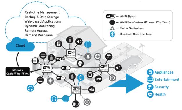 Matter有助于消费类物联网互联生态系统轻松实现即插即用,从而简化智能家居和智能办公环境。它在互联网协议之上提供一个层,其中包括一组适用于所有Matter连接设备的预定义方案。这使得 Matter 设备能够了解它们正在与什么类型的对象进行通信,以及这些对象有什么样的功能。Matter 使物联网终端设备或节点能够与各种 Wi-Fi 网络 pod 轻松通信。