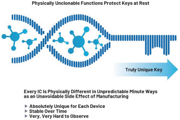不幸的是,由于直接探测会试图监视微电路的内部结构,因此通用微控制器中常用的存储器技术(即 EEPROM或闪存)并不安全。利用扫描电子显微镜(SEM),攻击者无需很高成本,即可直接监视存储器的内容。为了降低此风险,半导体行业开发了“物理不可克隆功能”(PUF) 技术。PUF 用来从微电路的固有物理属性中导出唯一密钥。这些因芯片而异的属性很难直接探测,因此难以通过直接探测提取生成的密钥。在一些情况下,PUF派生密钥会对信任根内部存储器的其余部分进行加密,从而保护设备上存储的所有其他密钥和凭据。