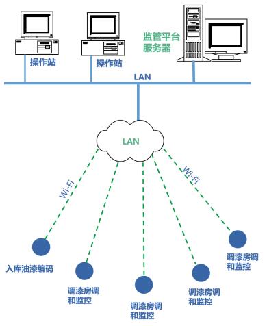 设计油漆调和监管系统,由监管平台服务器、油漆调和操作监控终端、电子枰、油漆编码终端、操作站等构成,通过工厂内的局域网(WI-FI)进行通信连接。
