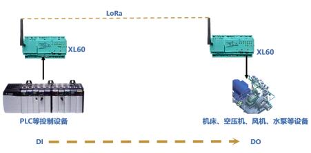选用一对基于LoRa无线传输模块的XL60无线采集装置,一台配置在作业现场作信号接收端,一台与PLC等控制仪表对接作信号发射端。发射端的XL60将控制仪表的启停命令,通过LoRa无线对传到接收端,实现无线远程控制设备启、停。