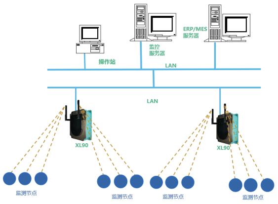 解决方案:XL90物联网关无线读取监测节点的数据,进行处理、协议转换,通过以太网(Ethernet)或Wi-Fi,接入局域网转发数据至MES、ERP、EMS等工厂数字化平台。