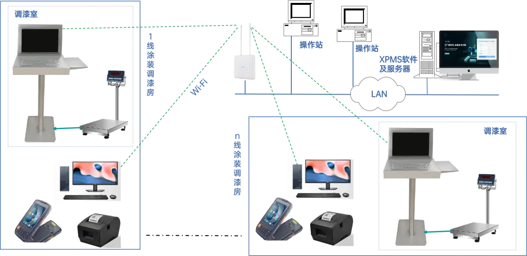 调漆终端是调漆操作的人机界面,安装在调漆房,由电脑、电子秤、扫描枪等防爆硬件组成,设备采用电池供电,通过Wi-Fi连接平台服务器。