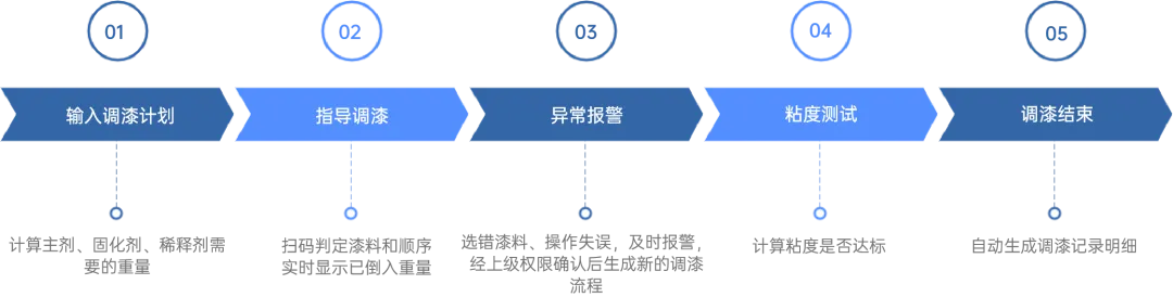 l 实现调漆过程可追溯,记录每一步调漆操作、质量、用料等,出现异常能快速定位问题;