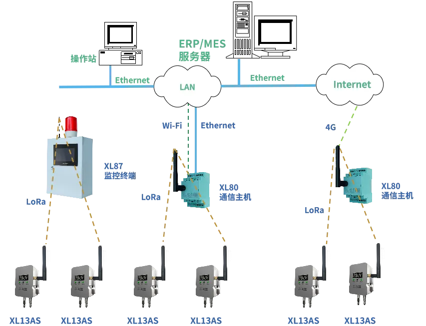 XL13AS无线风管风速传感器通过LoRa无线传输方式,将数据上传至XL802通信主机,通信主机可选以太网、Wi-Fi、4G通信方式,推送数据至监控平台、企业生产管控服务器等。