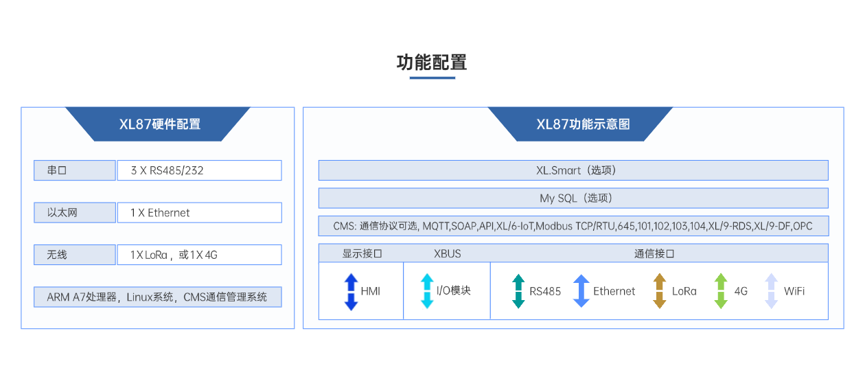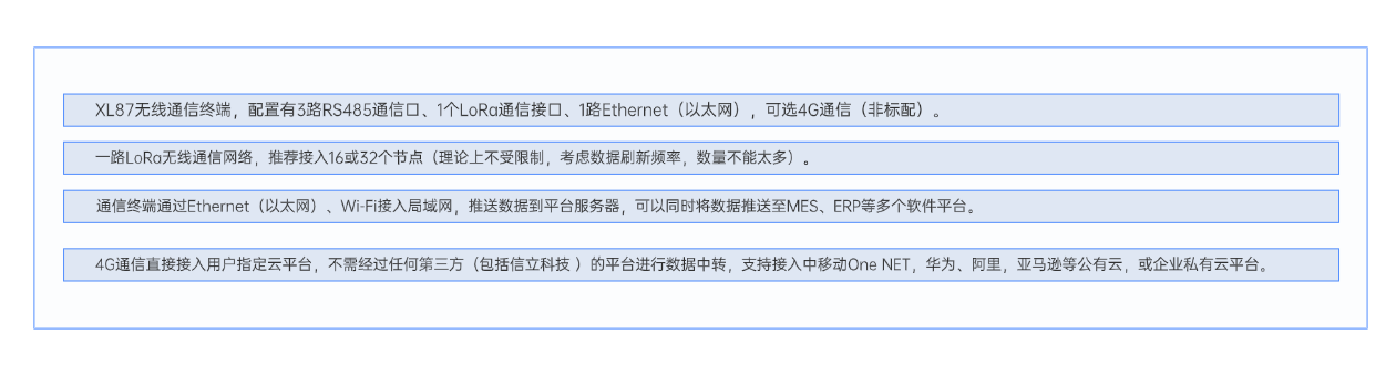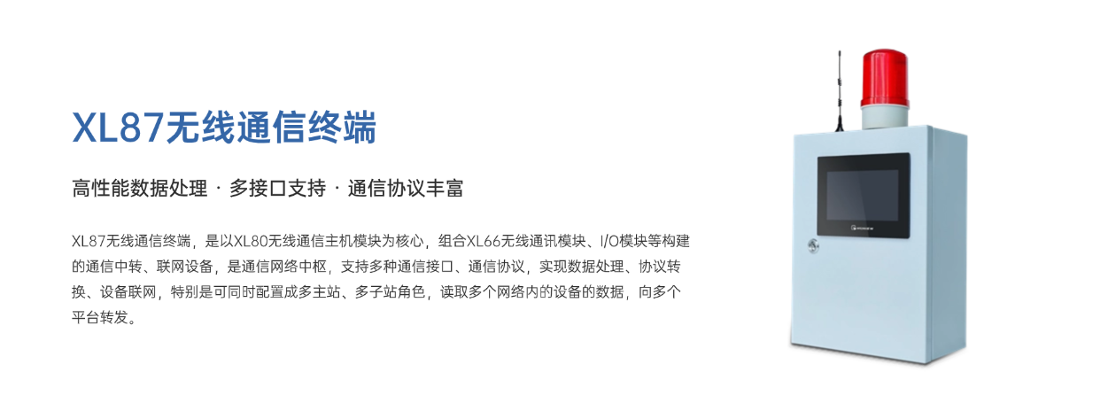 XL87无线通信终端,是以XL80无线通信主机模块为核心,组合XL66无线通讯模块、I/O模块等构建的通信中转、联网设备,是通信网络中枢,支持多种通信接口、通信协议,实现设备联网,特别是可同时配置成多主站、多子站角色,读取多个网络内的设备的数据,向多个平台转发。