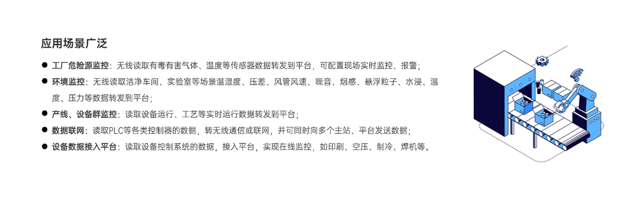 工厂危险源监控,无线读取有毒有害气体、温度等数据转发到平台,可配置现场实时监控、报警;