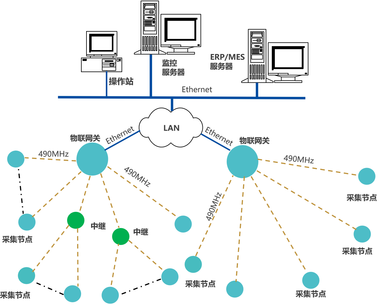采集节点数据,通过LoRa上传数据至物联网关,网关通过Ethernet或Wi-Fi,接入LAN,推送数据至企业生产管控服务器