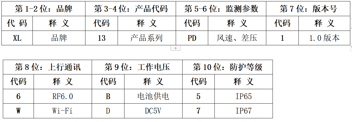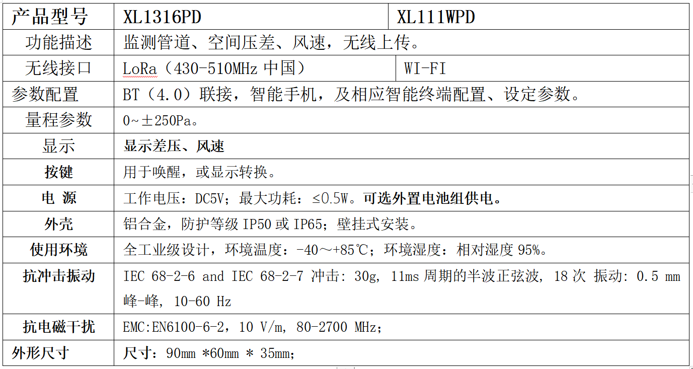 三、XL13无线风速(差压)传感器订购信息表