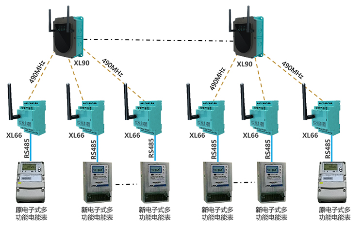 已安装有电子式多功能电能表的电能监测点(共有4个监测点),每个监测点配置1台XL66智能转换器,从电能表读取用电数据上传至XL90物联网关;