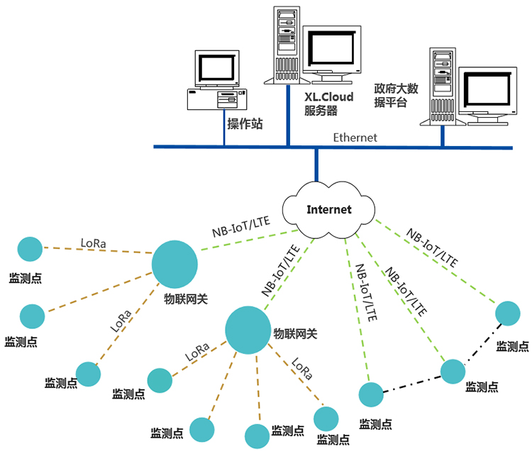 监测点的数据,通过LoRa上传汇聚到物联网关,物联网关再通过NB/4G,上传至监控服务器;应用于一台设备,或一套系统,有多个监测点,安装距离较近,集成在一台网关内上传,更便于配置、维护、管理。