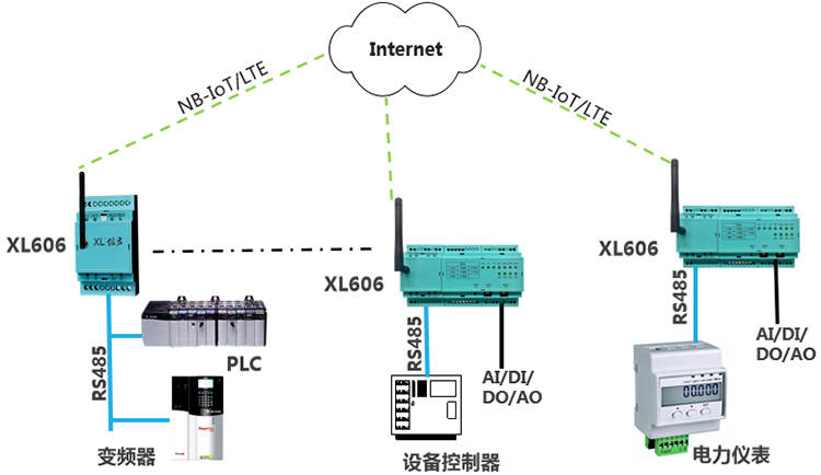 选择XL60主机模块,加I/O模块,采集环保设备的运行信号;通过RS485/Ethernet接口,从机器控制器、PLC读取设备运行数据;通过NB/4G上传数据到平台,4G网络信号更稳定;