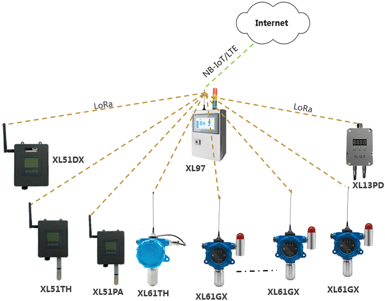 在需要监测环境参数的场景,选择XL97网关终端,读取传感器的数据,通过4G/NB推送至监控平台;
