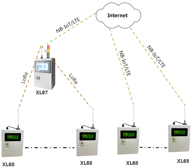 在一个监测点位置,需要监测多种环境参数,建议选择XL68环境监测终端,同时采集多种环境参数,通过4G/NB推送至监控平台;(也可选择通过LoRa上传到网关终端);