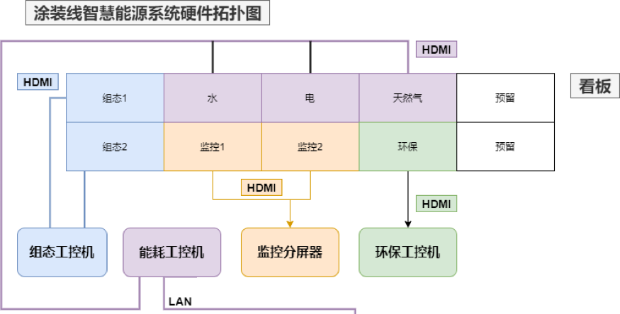 构建一套水、电、气能源消耗管控系统,采集涂装线主要设备、关键节点的水、电、气消耗数据。统计、计算分析主要设备、关键节点、整线,及车间的能源消耗情况,生成报表、曲线、柱状图,分析判定设备是否经济、高效运行。通过用电、用水、用气的数据,和设备额定数据进行分析判断,生产计划是否安排合理,生产工艺是否更优,设备是处于完好状态,还是存在隐性故障。