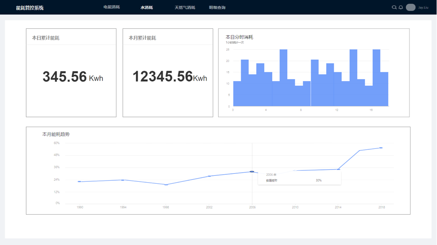 能源数据服务器,联接到展示厅能耗看板,在大屏上更直观的显示能耗数据,如本日累计消耗,本月累计消耗,柱状图用来显示本日每一小时的消耗量,曲线图显示本月每天能耗变化的情况。效果示意图如下: