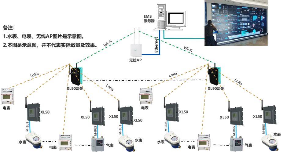 物联网关通过LoRa无线读取水、电、气等表计的数据,通过Wi-Fi推送数据至EMS(能源管理)服务器,无线AP起到桥梁作用。无线AP通过以太网接口,直接联接EMS服务器。