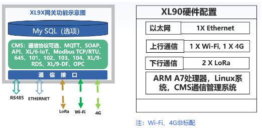 读取采集节点的数据,通过RS485、Ethernet、4G、Wi-Fi等通信方式,接入其它系统、设备,支持MQTT、SOAP、Modbus、104、645等协议,API、Redis,XL/9-DB 写数据库,可为用户开发通信协议。
