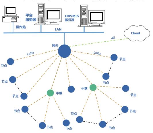 网关无线读取所覆盖区域内监测点的数据,进行处理、协议转换,通过局域网转发数据至MES、ERP、EMS等工厂数字化平台,对数据进行分析,根据不同的报警阈值实现预警。