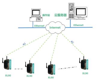 对于安装分散、距离远的监测点,可通过XL90网关构建一个小的物联网数据采集系统。网关无线读取区域内各监测点的数据,通过4G推送数据至云平台。