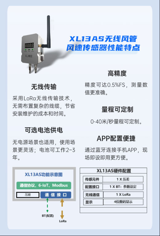选择 XL13AS 无线风管风速传感器 ,对排风管风速实时监测。带显示,现场可直观了解当前风速。