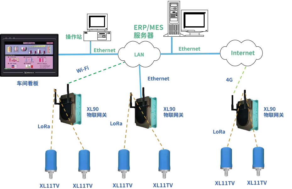监测系统采用无线传输设计,XL11TV温振传感器采用LoRa 无线传输数据给XL90网关,网关对数据进行协议转换后,通过Ethernet/WiFi/4G传输数据至监控平台。